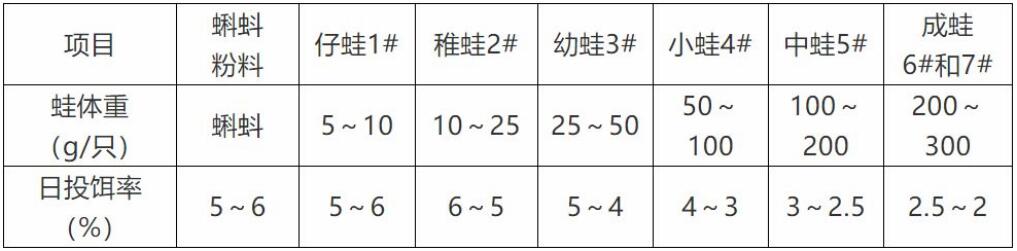« 根据蛙规格及数量,参考投饵参考表中推算投饵量,再根据天气、水温、水质、饵料台观察情况、蛙摄食和健康状况等予以适当调整。